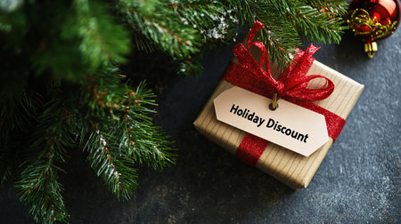 A beautifully wrapped holiday gift box featuring a red ribbon and a discount tag, placed beside a festive Christmas tree. Perfect for showcasing seasonal cheer.