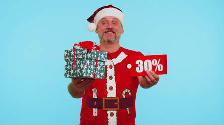 Man wears red New Year t-shirt showing gift boxes and 30 Percent discount inscriptions banner text. Black Friday. Advertising low prices shopping. Blue studio wall background. Merry Christmas holidays