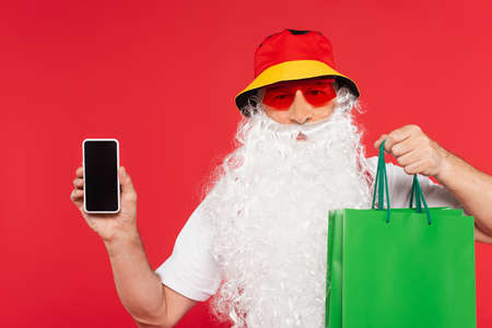 Santa claus in sunglasses holding shopping bags and smartphone with blank screen isolated on red