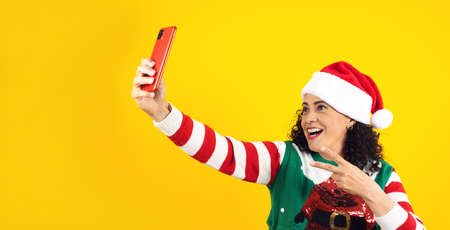 Portrait of senior latin woman holding mobile phone taking a photo selfie in a christmas concept on yellow background