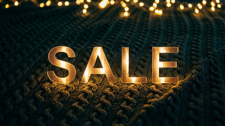 Golden illuminated text spelling SALE on a dark knitted fabric with glowing fairy lights