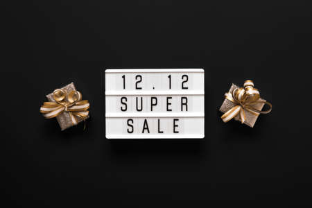 Lightbox with text SUPER SALE and golden gift boxes on black background. Double 12 Mega sales day flat lay promotion composition.