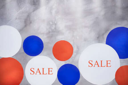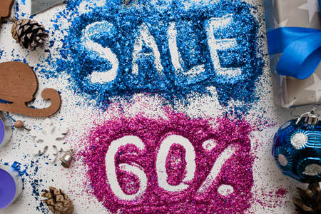 Sales on Christmas and New Year holidays, top view close up. Colorful decoration with informative inscription of 60 pct discount for shop-windows, shopping malls and advertizing background concept