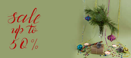 Merry Christmas and happy new year. Card, banner, flat lay, a flyer for a Christmas discount, text - sale up to 50 percent