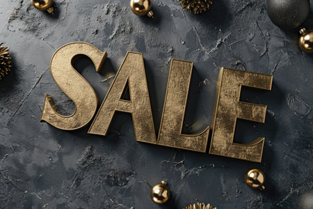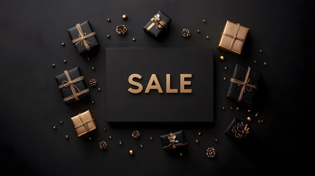 The image features a striking black background showcasing a prominent golden 'SALE' text with festive gifts. Cheerful atmosphere adorned with shiny decorations enhances the shopping spirit.