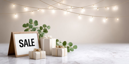 Sale gifts display on marble table with wrapped present box and eucalyptus under warm string light creating cozy festive scene