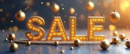 A dazzling SALE sign adorned with bright lights stands out against a softly blurred background, surrounded by shimmering golden ornaments. This festive scene radiates excitement and allure, perfect for capturing the spirit of holiday shopping and special promotions.