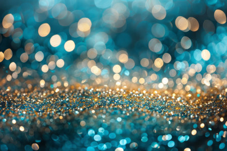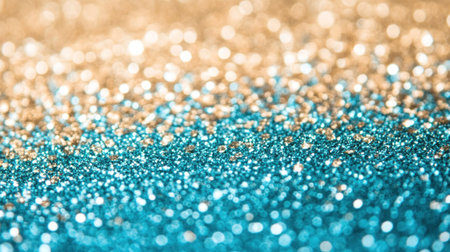 Close-up of shimmering teal glitter with soft, defocused bokeh lights, creating a vibrant, sparkling, and festive abstract background.