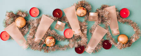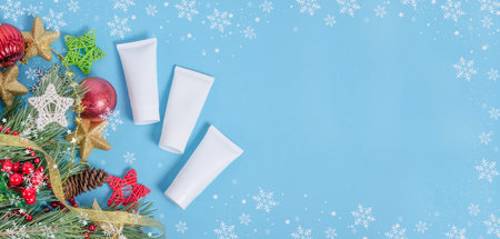 Baner background - Christmas cosmetics sale. Tubes of creams with a Christmas decoration on a blue background with a frame of snowflakes with a copy space