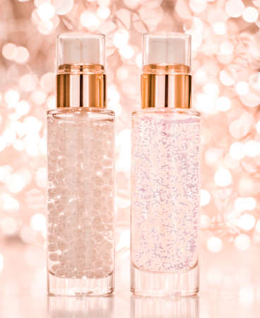 Cosmetic branding, blank label and glamour present concept - Holiday make-up base gel, serum emulsion, lotion bottle and rose gold glitter, luxury skin and body care cosmetics for beauty brand ads