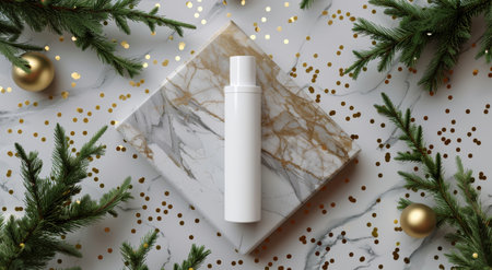 A white marble surface with a white bottle, pine branches, and gold glitter for a festive and minimalist background.