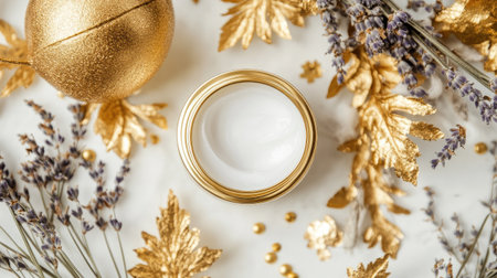 A luxurious flat lay featuring a cream jar surrounded by golden leaves and lavender flowers, perfect for holiday themes, beauty products, or wellness.
