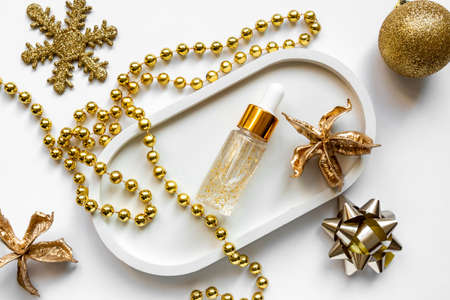 Festive presentation of luxury skin care beauty face serum with 24k gold inclusions. Face treatment beauty oil on white ceramic tray with golden decorations.