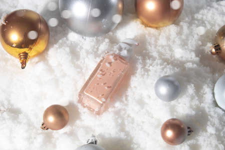 white snow background with lifestyle, cosmetic makeup bottle lotion cream product mockup with beauty fashion skincare for merry christmas festival gift
