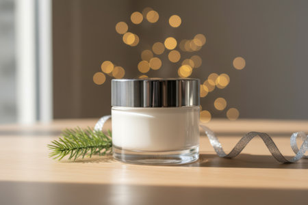 Cosmetic jar with festive bokeh lights and pine branch.