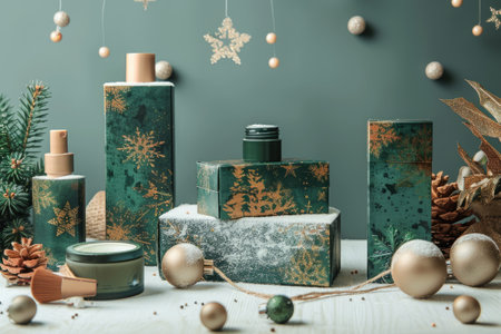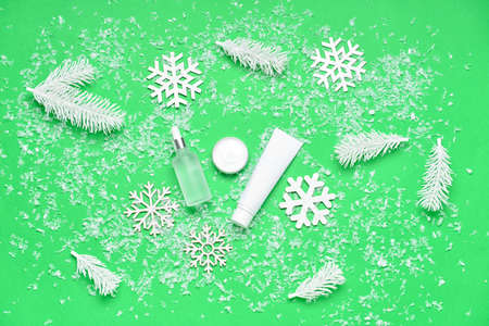 Different cosmetic products and winter decor on green background