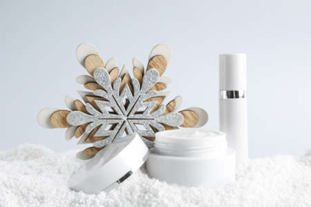 Jar of hand cream and lip balm near decorative snowflake on snow against light background. Winter skin care cosmetics