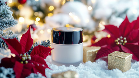 Festive skincare gift surrounded by holiday decorations with snow and poinsettias