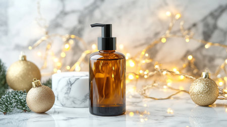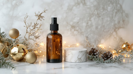 Aromatic amber bottle on a marble surface surrounded by festive ornaments and warm lights