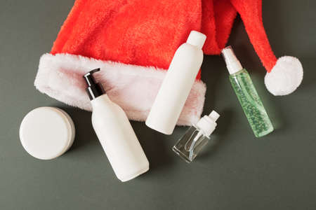 different mock up cosmetic bottles and jars in red Sanata Hat on green background. Christmas sale of beauty products concept. copy space