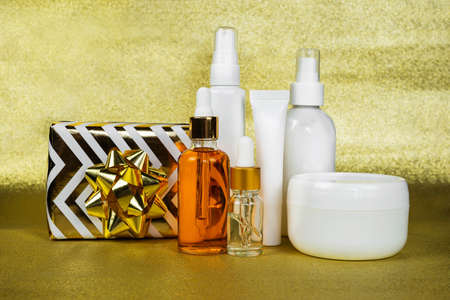 Care cosmetics for womens holidays. Copy space with night, day cream cosmetic oil, eye cream on light yellow brilliant glamorous background. Unbranded bottles in mockup style. Beauty background.