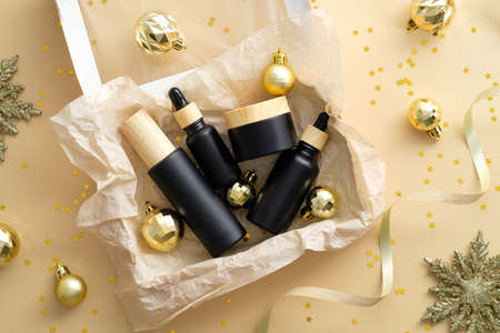 Self care package, seasonal gift box with black and wooden bottles and Christmas golden balls, decorations on pastel begie background.