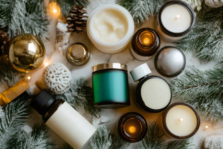Flat lay of skincare products, candles, and Christmas decorations on a marble surface, creating a cozy winter skincare vibe