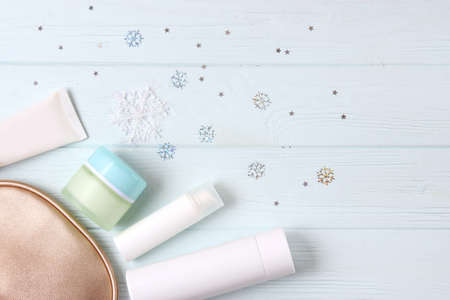 Winter care cosmetics on a colored background top view.