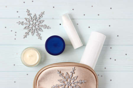 Winter cosmetics and snowflakes on a white background. Flat lay, top view.