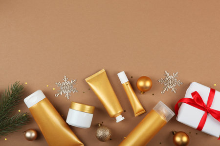 Top view composition of small traveling bottles and jars for cosmetic products with Christmas decorations. Facial skin care concept with copy space for your design. Cosmetic mock up