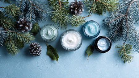 Winter skincare set arranged with icy blue tones and pine accents.