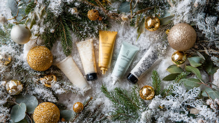 A cream tube with a festive design sits on a table with golden glitter, surrounded by a pine branch adorned with ornaments.