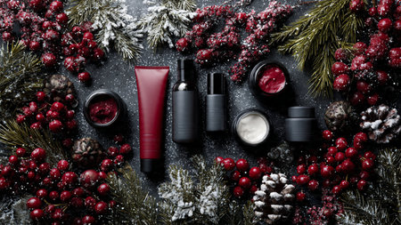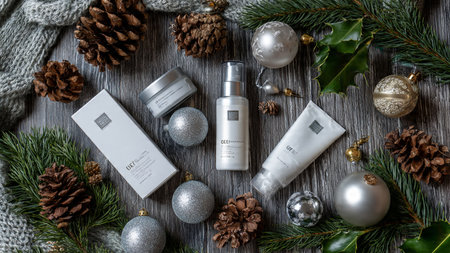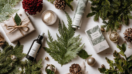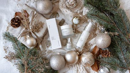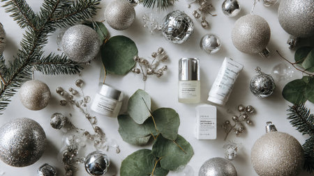 Holiday-themed flat lay with premium skincare and festive decor.