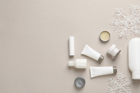 Flat lay composition with cosmetic products and snowflakes on light gray background, space for text. Winter skin care