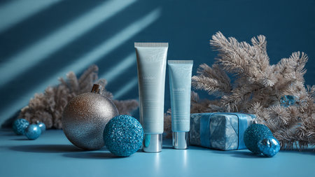 Skincare displayed in warm holiday ambiance with blurred tree lights.