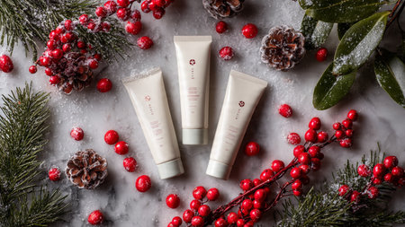 Skincare products and natural winter elements with a soft focus, conveying holiday beauty tips and skin nourishment.