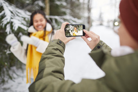 Close-up of man photographing woman on mobile phone while she posing against the snowy trees outdoors