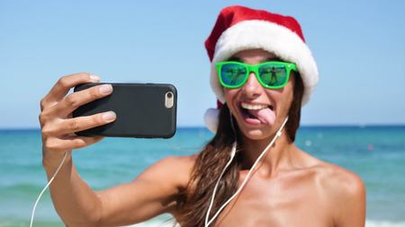 Beautiful girl doing selfie on the beach in the Santa Claus hat, wearing sunglasses, on a white swimsuit and white headphones.