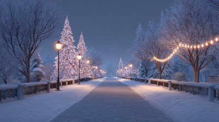 A breathtaking view of a tranquil snowy pathway adorned with glowing street lamps and beautifully lit Christmas trees, creating a magical winter evening scene.