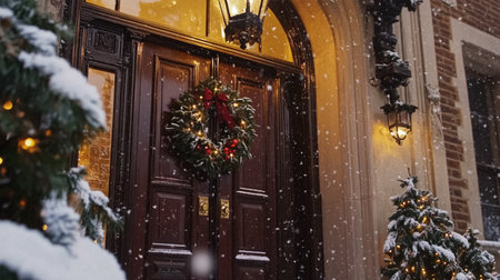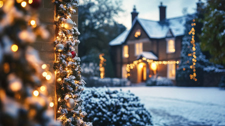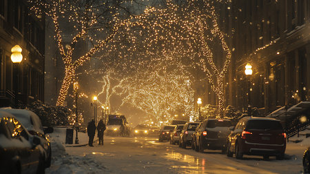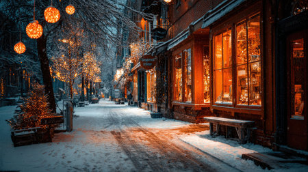 A charming street scene covered in snow, illuminated by warm Christmas lights and garlands, with silhouetted figures...