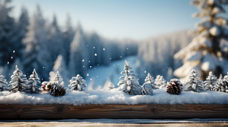A snow covered window sill with pine cones in the foreground, mockup, space for product on wooden podium