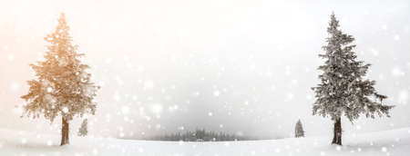 Winter landscape with snowy fir trees in the forest and falling snowflakes