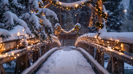 A picturesque winter scene featuring a charming bridge adorned with twinkling lights and surrounded by snow-covered trees, evoking a magical holiday atmosphere.