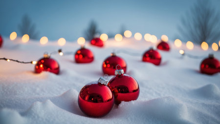 AI Generated. Festive red ornaments surrounded by snow and winter lights at dusk