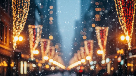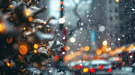 Blurred showing festive winter snowfall with blurred city lights and bokeh effects creating a magical atmosphere...