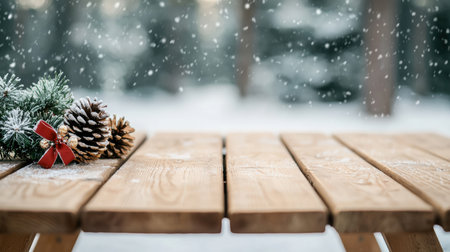 Snowy wooden table with pine cones and a red bow. High quality photo.
