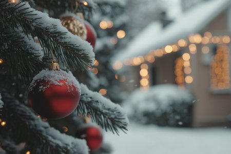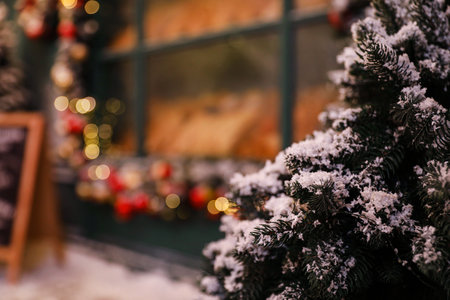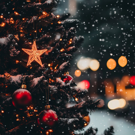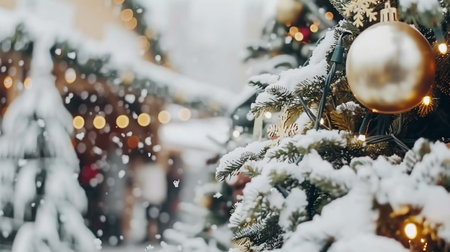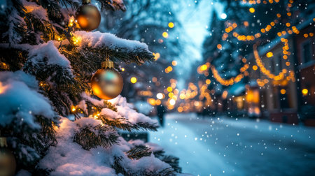 Close-up of Christmas tree with ornaments, with festive street lights in the background. Snow-covered branches and golden decorations. Cozy winter evening.