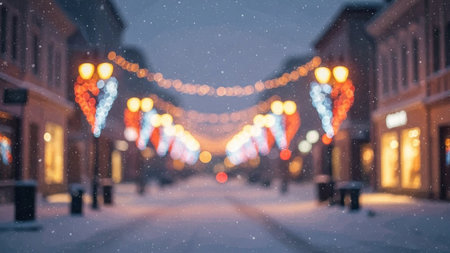 A tranquil winter evening scene featuring a snowy street adorned with warm lights and festive decorations in a charming town, creating a magical holiday atmosphere.