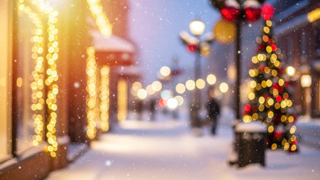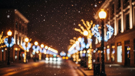 Golden showing snowy winter street scene at night with blurred warm golden christmas lights and festive decorations...