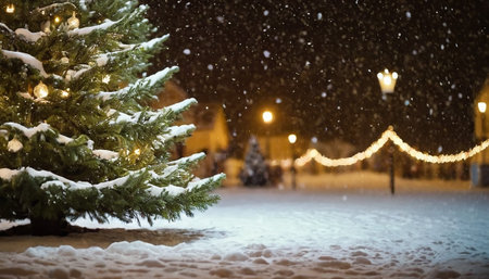 A close-up of a snow-covered Christmas tree with warm lights, set against a dark, snowy night in a town square with bokeh lights.